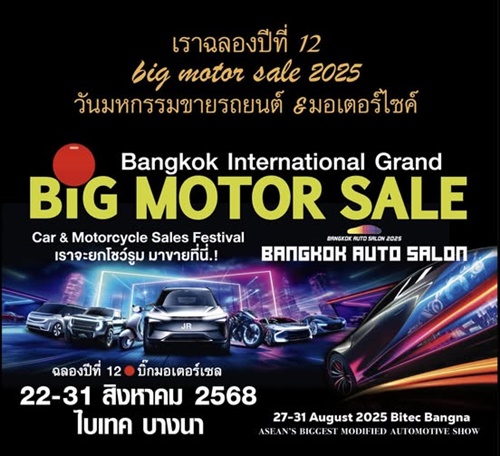 - BIG MOTOR SALE 2025 เป็นมหกรรมขายรถยนต์และมอเตอร์ไซค์ในแบบ “ยกโชว์รูมมาไว้ที่นี่” เพื่อการใช้งานที่คุ้มค่าพร้อมแค็มเปญน่าสนใจ มีทั้งรถใหม่และรถยูสด์คาร์พรีเมี่ยมตลอดจนมอเตอร์ไซค์หลากหลายรูปแบบให้เลือกใช้งานอย่างจุใจ วันแสดงงาน : 22 – 31 สิงหาคม 2568