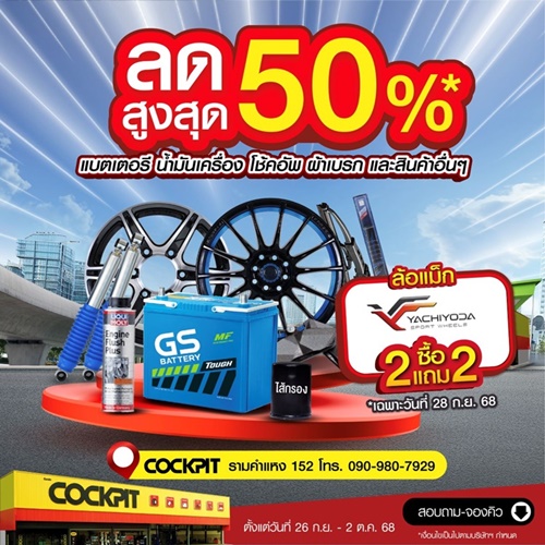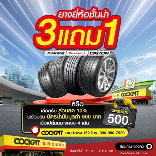 ค็อกพิท (COCKPIT) ศูนย์บริการรถยนต์ครบวงจรฟาสต์ฟิต ภายใต้การบริหารงานของบริษัท บริดจสโตน เอ.ซี.ที (ประเทศไทย) จำกัด รุกขยายสาขาใหม่ในกรุงเทพฯกับ “ค็อกพิท รามคำแหง 152” ตั้งอยู่ในปั๊มบางจาก ติดปากซอยรามคำแหง 152 บนถนนรามคำแหงขาเข้า ฉลองเปิดสาขาใหม่ด้วยโปรโมชันจัดเต็มพร้อมเสิร์ฟให้คนรักรถเพียบตลอด 7 วัน ตั้งแต่วันที่26 กันยายน 2568 - 2 ตุลาคม 2568 ชวนมาเปลี่ยนยางรถยนต์ BRIDGESTONE, FIRESTONE หรือ DAYTON ทุกรุ่น ทุกขนาดที่ร่วมรายการครบ 3 เส้น แถมฟรีอีก 1 เส้น, ยางรถยนต์แบรนด์ชั้นนำลด 10% และผลิตภัณฑ์ดูแลรถยนต์อื่นๆ อีกมากมาย ลดสูงสุดถึง 50% พิเศษ! สำหรับลูกค้าที่ลงทะเบียนในงาน Grand Opening Day วันที่ 28 กันยายน 2568 ยังสามารถลุ้นรับสิทธิ์ซื้อยางรถยนต์ BRIDGESTONE, FIRESTONE หรือ DAYTON 2 เส้น แถมฟรีอีก 2 เส้น จำนวน 30 สิทธิ์เท่านั้นและส่วนลดอื่นๆ อีกมากมาย พบกับกิจกรรมร่วมสนุกลุ้นรับของรางวัลได้ภายในงาน แวะค็อกพิทที่เดียว ครบ จบ คุ้ม เรื่องการดูแลรถยนต์ของคุณ