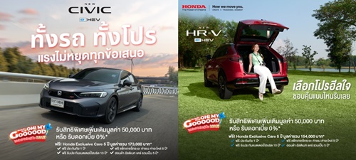 บริษัท ฮอนด้า ออโตโมบิล (ประเทศไทย) จำกัด จัดโปรแรงส่งท้ายปีกับแคมเปญ “Honda Pro OH! MY GOOOOOD PLUS+” เพิ่มเติมทางเลือกใหม่สำหรับรถยนต์สองรุ่นฮิตในไลน์อัป Honda e:HEV – The EXCITING Hybrid ทั้ง Honda Civic e:HEV และ New Honda HR-V e:HEV มอบความคุ้มค่าที่ “ตรงใจ เลือกได้เอง” ให้คุณเลือกได้ดั่งใจรับสิทธิพิเศษเพิ่มเติมมูลค่า 50,000 บาท หรือ เลือกรับดอกเบี้ยพิเศษ 0% พร้อมรับ Honda Exclusive Care 5 ปี มูลค่าสูงสุด 173,000 บาท** ให้การเป็นเจ้าของรถยนต์ทั้งสองรุ่นเป็นเรื่องง่ายกว่าที่เคย สำหรับลูกค้าที่จองรถยนต์ตั้งแต่วันที่ 1 พฤศจิกายน 2568 – 11 ธันวาคม 2568 และรับรถภายในวันที่ 31 ธันวาคม 2568 อย่าพลาด! โปรแรงแห่งปีที่ทำให้ความฝันของคุณเป็นจริง