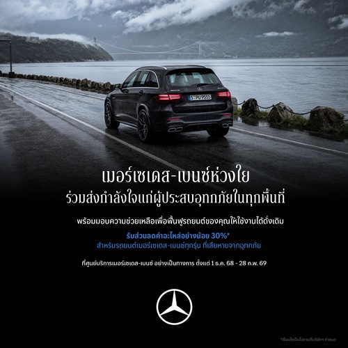 นอกจากนี้ เมอร์เซเดส-เบนซ์ พร้อมมอบส่วนลดค่าอะไหล่อย่างน้อย 30% สำหรับรถยนต์ทุกรุ่นที่ได้รับความเสียหายจากเหตุการณ์อุทกภัย เพื่อเป็นการช่วยเหลือและฟื้นฟูรถยนต์ของลูกค้าทุกคนให้กลับมาใช้งานได้ตามปกติ โดยลูกค้าที่ได้รับผลกระทบ สามารถติดต่อได้ที่ศูนย์บริการเมอร์เซเดส-เบนซ์ อย่างเป็นทางการ ตั้งแต่วันที่ 1 ธันวาคม 2568 – 28 กุมภาพันธ์ 2569