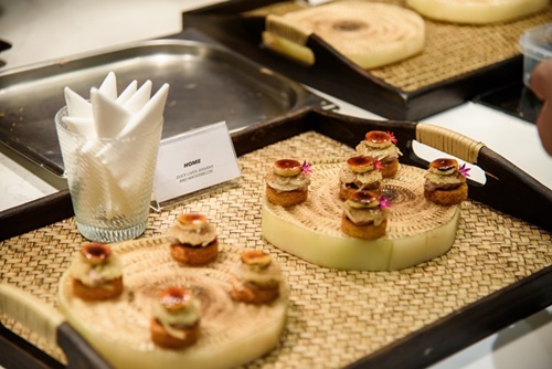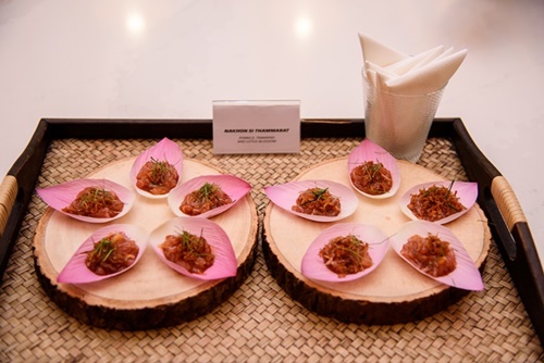 งานเลี้ยงอาหารค่ำเริ่มต้นด้วยการเสิร์ฟอาหารว่างแบบ 3 คำ โดยแต่ละคำสะท้อนเอกลักษณ์ของภูมิภาคที่แตกต่างกันของไทย พร้อมเผยให้เห็นความหลากหลายและรุ่มรวยทางอาหารในประเทศไทย