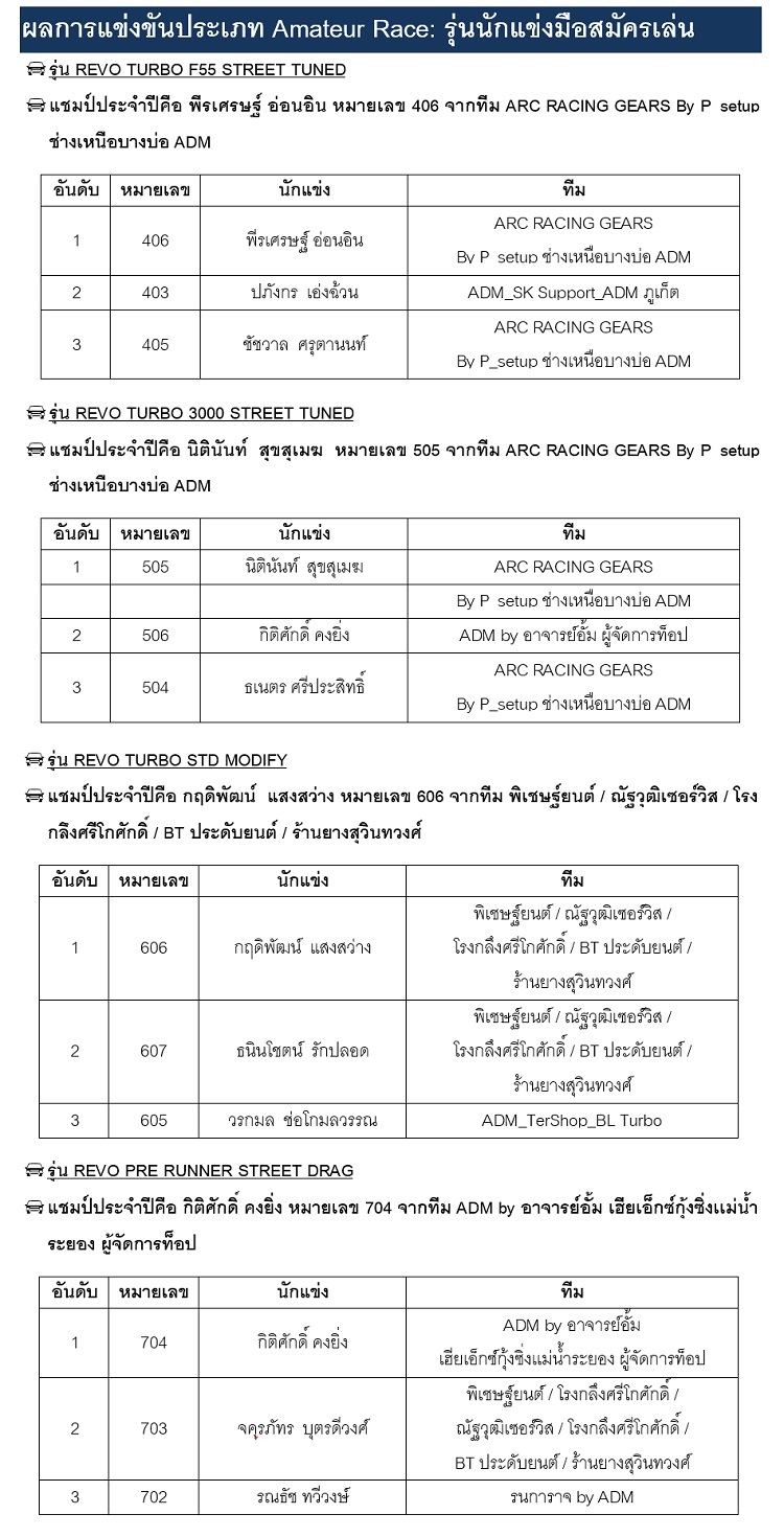 ฤดูกาลนี้นับเป็นอีกก้าวความสำเร็จของกิจกรรม Hilux REVO Racing Mania โดยมีรถสมัครเข้าร่วมการแข่งขันกว่า 300 คัน มียอดผู้เข้าชมออนไลน์จากทั้ง 4 สนาม รวมกว่า 3.5 ล้านครั้ง และผู้เข้าชมไลฟ์สูงสุดขณะการแข่งขันถึง 20,000 คน แสดงให้เห็นถึงฐานคอมมูนิตี้ที่ขยายวงกว้างเพิ่มมากขึ้นอย่างแท้จริง”