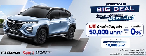 บริษัท ซูซูกิ มอเตอร์ (ประเทศไทย) จำกัด เดินหน้ากระตุ้นตลาดเตรียมรับงานมอเตอร์โชว์ ด้วยการจัดแคมเปญพิเศษ “BIG DEAL” สำหรับลูกค้าที่สนใจเป็นเจ้าของ ALL NEW SUZUKI FRONX สปอร์ตเอสยูวีดีไซน์เอกลักษณ์เฉพาะตัว มาพร้อมเทคโนโลยีล้ำสมัยและระบบความปลอดภัยครบครัน โดยมอบข้อเสนอพิเศษ อัตราดอกเบี้ยเริ่มต้น 0% หรือเลือกรับฟรีบัตรเติมน้ำมันมูลค่าสูงสุด 50,000 บาท