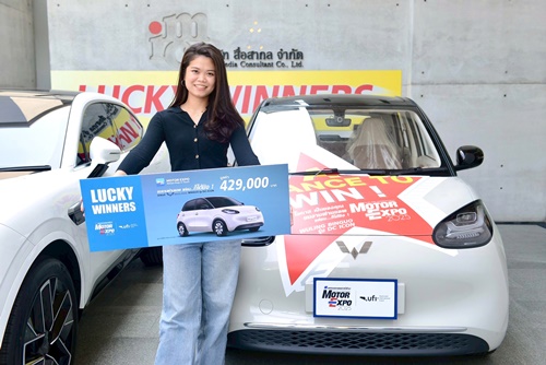 คุณชไมพร ปภัสร์พงษ์ รองประธานจัดงาน ควบคุมงานด้านการตลาดสัมพันธ์ มอบรางวัลรายการ “ชมงานผ่าน MOTOR EXPO APP ชิงรถ" WULING BINGUO รุ่น DC ICON มูลค่า 429,000 บาท ผู้ได้รับรางวัล ได้แก่ กมลพร ชลไชยะ จังหวัดร้อยเอ็ด