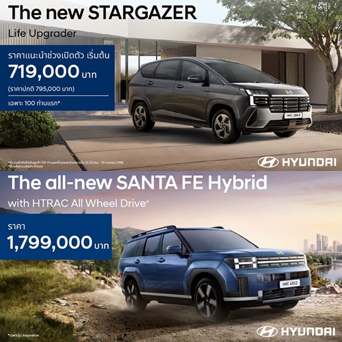 บริษัท ฮุนได โมบิลิตี้ (ประเทศไทย) จำกัด เดินเกมรุกตลาดรถยนต์ไทยอย่างต่อเนื่องในงาน บางกอก อินเตอร์เนชั่นแนล มอเตอร์โชว์ ครั้งที่ 47 ด้วยการขนทัพยนตรกรรมหลากหลายเซกเมนต์ ครอบคลุมทั้งรถยนต์เครื่องยนต์สันดาปภายใน รถยนต์ไฮบริด และรถพลังงานไฟฟ้า มาจัดแสดงอย่างครบถ้วน พร้อมเปิดตัวรถยนต์ใหม่ 2 รุ่นสำคัญที่หลายคนรอคอย ได้แก่ Hyundai all-new SANTA FE Hybrid with HTRAC All Wheel Drive และ Hyundai new STARGAZER เสริมทัพด้วยรถรุ่นไฮไลต์ของแบรนด์อย่าง Hyundai PALISADE, Hyundai STARIA, IONIQ 6 และ IONIQ 5 N พร้อมอัดโปรแรงภายใต้แคมเปญ “Hyundai Double Thumbs Up Deal – อัปให้สุด สุข x2” เพื่อกระตุ้นตลาดช่วงต้นปี และเปิดโอกาสให้ผู้บริโภคชาวไทยได้สัมผัสนวัตกรรมยานยนต์จากฮุนได พร้อมข้อเสนอพิเศษที่ช่วยให้การเป็นเจ้าของรถยนต์ฮุนไดเป็นเรื่องง่ายยิ่งขึ้น