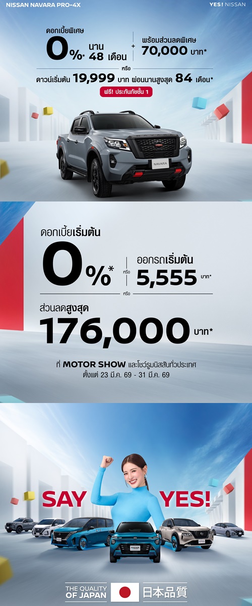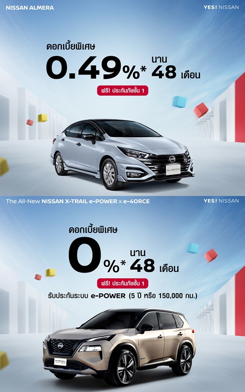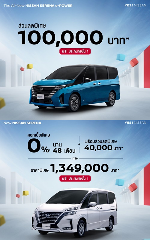 เพื่อช่วยให้ลูกค้าเป็นเจ้าของรถยนต์คุณภาพสูงจากนิสสันได้ง่ายขึ้น นิสสันส่งแคมเปญพิเศษ “SAY YES” ที่มอบข้อเสนอหลากหลายตั้งแต่ดอกเบี้ยต่ำ ดาวน์น้อย ผ่อนสบายนานสุด 84 เดือน ** และข้อเสนอพิเศษเฉพาะรุ่นหลัก ได้แก่ ส่วนลด 100,000 บาท พร้อมฟรีประกันภัยชั้น 1 สำหรับนิสสัน เซเรน่า อี-พาวเวอร์ และ ดอกเบี้ย 0% พร้อมประกันภัยชั้น 1 สำหรับนิสสัน เอ็กซ์เทรล อี-พาวเวอร์ อี-ฟอร์ซ