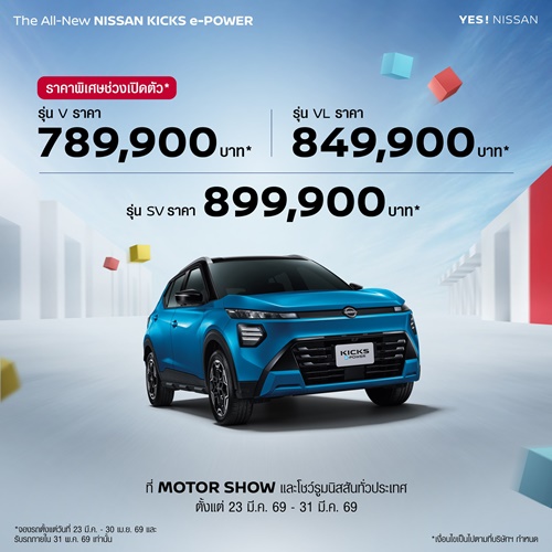 พิเศษสุดเฉพาะช่วงเปิดตัว นิสสัน เตรียมมอบความคุ้มค่าให้คุณเป็นเจ้าของ นิสสัน คิกส์ อี-พาวเวอร์ ใหม่ ได้ง่าย ๆ ด้วยราคาพิเศษในรุ่น V เพียง 789,900 บาท รุ่น VL เพียง 849,900 บาท และรุ่น SV เพียง 899,900 บาท พร้อมอัตราดอกเบี้ยพิเศษ 1.49% พร้อมอุ่นใจด้วยการรับประกันที่ครอบคลุม ได้แก่ รับประกันตัวรถ 5 ปี หรือ 150,000 กม.* รับประกันระบบอี-พาวเวอร์ 5 ปี หรือ 150,000 กม.* และการรับประกันแบตเตอรี่ 10 ปี ไม่จำกัดระยะทาง** ฟรีประกันภัยชั้น 1 NPP เฉพาะรุ่น VL และ SV** โดยต้องจองรถตั้งแต่วันที่ 23 มีนาคม – 30 เมษายน 2569 และออกรถภายในวันที่ 31 พฤษภาคม 2569**