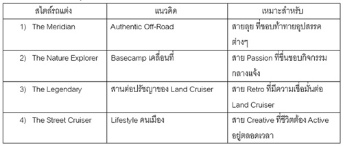 ขณะเดียวกัน ตลาด PPV ยังมีกลุ่มลูกค้าอีกกลุ่มหนึ่ง ได้แก่ ผู้ที่โสดหรือมีครอบครัวขนาดเล็ก รวมถึงผู้ที่หลงใหลการขับขี่สายลุยและการตกแต่งรถยนต์ ซึ่งมองหารถที่เปรียบเสมือน Hobby Car มีขนาดกะทัดรัด สามารถปรับแต่งได้ ใช้งานในชีวิตประจำวันได้อย่างคล่องตัว และในวันหยุดยังสามารถออกไปสัมผัสความสนุกบนเส้นทางออฟโรด พร้อมใช้ชีวิตอย่างอิสระในทุกเส้นทาง สำหรับลูกค้ากลุ่มนี้ Land Cruiser FJ คือคำตอบที่เหมาะสมที่สุด