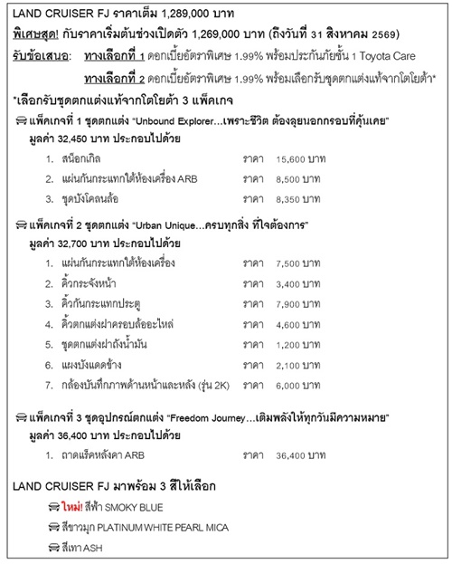 Land Cruiser FJ เปิดตัวด้วยรุ่นย่อย 4WD พร้อมตัวเลือกสีและอุปกรณ์ต่าง ๆ ตามที่นำเสนอภาย ในงาน โดยมีราคาอย่างเป็นทางการดังนี้