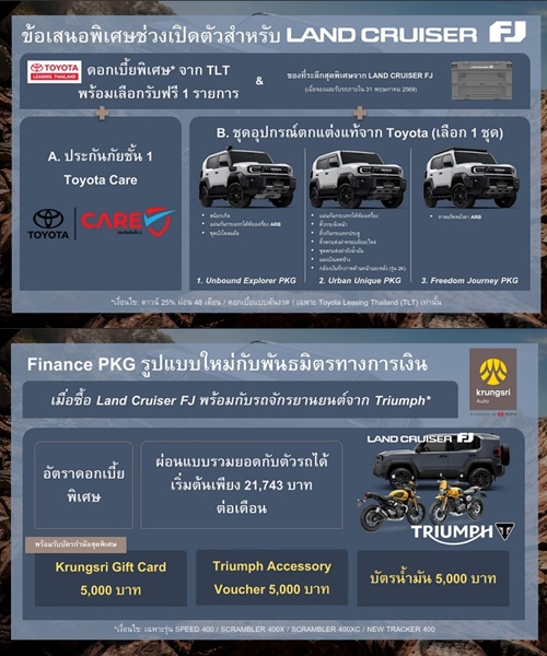 และพิเศษสุดในงานมอเตอร์โชว์ เปิดตัวแคมเปญพิเศษตอบโจทย์ไลฟ์สไตล์ลูกค้า LAND CRUISER FJ สายลุย โตโยต้าจับมือ Krungsri Auto และแบรนด์รถจักรยานยนต์ระดับพรีเมียม Triumph ในการนำร่องแพ็กเกจการเงินรูปแบบใหม่ ให้ลูกค้าเป็นเจ้าของรถยนต์ และรถจักรยานยนต์ได้พร้อมกัน ด้วยแพ็กเกจผ่อนชำระรวมทั้งสองคัน เริ่มต้นเพียง 21,743 บาทต่อเดือน และมากไปกว่านั้นยังได้รับ Krungsri Gift Card มูลค่า 5,000 บาท / Triumph Accessory Voucher มูลค่า 5,000 บาท และบัตรเติมน้ำมันมูลค่า 5,000 บาทจากโตโยต้า ตั้งแต่วันที่ 23 มีนาคม จนถึง 5 เมษายน 2569