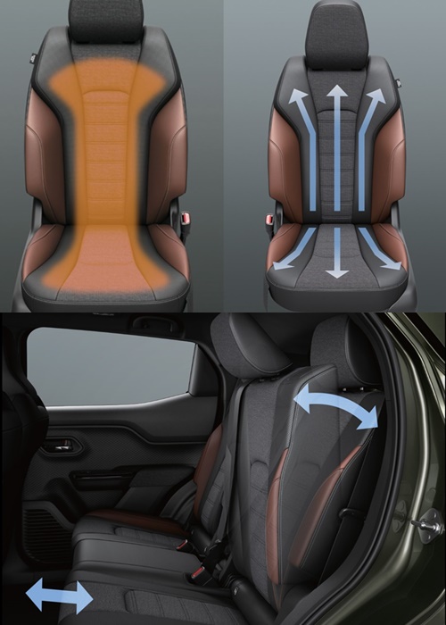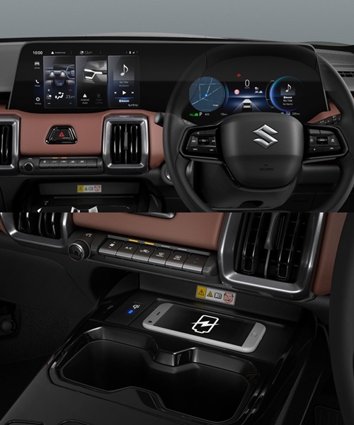 การออกแบบภายในห้องโดยสาร ALL NEW SUZUKI e VITARA ได้รับการออกแบบอย่างพิถีพิถันให้มีความกลมกลืนสอดคล้องกับรูปแบบภายนอกผสานความเป็นรถยนต์ไฟฟ้าและสมรรถนะการขับขี่ในแบบฉบับของรถ SUV ได้อย่างลงตัว โดยเน้นด้านเทคโนโลยีที่ทันสมัย อาทิ หน้าจอแสดงผลแบบ Integrated Display System ที่ออกแบบให้เชื่อมต่อทุกข้อมูลการขับขี่และฟังก์ชันการใช้งานไว้อย่างครบครันในหน้าจอเดียว ช่วยให้ผู้ขับขี่สามารถเข้าถึงข้อมูลได้อย่างสะดวกและรวดเร็ว โดยแบ่งการแสดงผลออกเป็นหน้าจอมาตรวัดขนาด 10.25 นิ้ว ที่รองรับการปรับรูปแบบการแสดงผลได้ถึง 3 รูปแบบ เพื่อให้เหมาะสมกับความต้องการของผู้ขับขี่ และหน้าจอระบบสัมผัสบริเวณคอนโซลกลางขนาด 10.1 นิ้ว รองรับการเชื่อมต่อสมาร์ตโฟนผ่าน Apple CarPlay และ Android Auto มาพร้อมระบบเครื่องเสียงคุณภาพสูงจาก Infinity ที่ติดตั้งลำโพงถึง 8 ตำแหน่ง พร้อมซับวูฟเฟอร์และแอมพลิไฟเออร์โดยทำงานร่วมกับ Digital Signal Processor เพื่อปรับแต่งคุณภาพเสียงให้มีความสมดุล คมชัด และสมจริงในทุกมิติ ช่วยยกระดับประสบการณ์ความบันเทิงตลอดการเดินทาง อีกทั้งไฟสร้างบรรยากาศภายในห้องโดยสาร ปรับเปลี่ยนได้ 12 เฉดสี ปรับระดับความสว่างได้ 7 ระดับ และแผงประตูดีไซน์เฉพาะตัว ที่ยังคงความเป็น SUV 4WD คอนโซลหน้าทรงสูงให้ความรู้สึกมั่นคง ระบบปรับอากาศแบบอัตโนมัติพร้อมแผ่นกรองอากาศ PM 2.5 และแท่นชาร์จไร้สาย พวงมาลัยดีไซน์ในรูปทรงสี่เหลี่ยมโค้งมนด้านล่าง ช่วยเพิ่มความสะดวกในการขึ้น-ลงรถ พร้อมติดตั้งปุ่มควบคุมฟังก์ชันต่างๆ อย่างครบครันในตำแหน่งที่ใช้งานง่าย ช่วยให้ผู้ขับขี่สามารถควบคุมระบบต่างๆ ได้อย่างมั่นใจและปลอดภัย รวมถึงเบาะนั่งที่ถูกออกแบบเพื่อรองรับความสะดวกสบายในการขับขี่ เบาะนั่งด้านคนขับปรับไฟฟ้า 10 ทิศทาง พร้อมด้วยระบบปรับความอุ่นของเบาะนั่งคู่หน้า เบาะผู้โดยสารตอนหลังปรับพับได้แบบ 4:2:4 และสามารถสไลด์เลื่อนหน้า-หลังได้ เพื่อรองรับความสะดวกสบายในการขับขี่ในทุกเส้นทาง